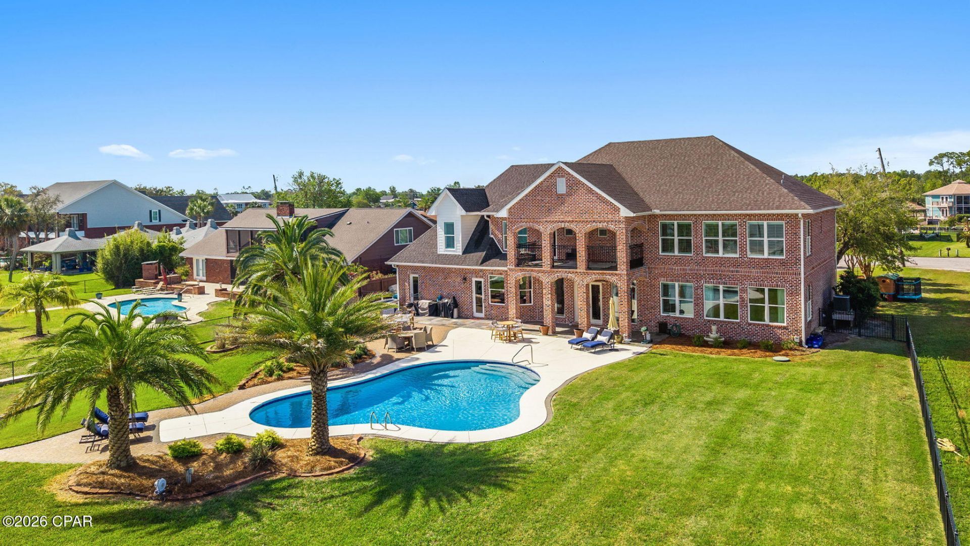 Coastal living at its finest! Discover your WATERFRONT slice of paradise in the heart of Lynn Haven, Florida, where everyday living feels like a permanent vacation. This stunning 2-story, 5-bedroom, 6-bathroom home with NO HOA features 5,575 square feet, a private pool and with pure Bay views, it offers the perfect blend of Florida charm and modern comfort, just minutes from pristine beaches and world-class fishing out your back door. Where privacy meets paradise, this bayfront estate is nestled on a quiet cul-de-sac with 130' water frontage on Upper Goose Bayou. This magnificent home sits on an expansive . 79-acre homesite featuring your own private beach area and boat dock, with an additional dock currently in development. Wake up each morning in the luxurious main-level primary suite to breathtaking water views and the sea breezes from your covered back porch. You're going to love the oversized bedrooms, walk-in closets and high ceilings in this home! This estate also features a large bonus/flex room centered in the middle of the bedrooms upstairs as well as a very large flex bonus room which is great for an additional game room, storage for holiday items or even an additional bedroom, if needed. The upstairs is complete with a kitchenette and laundry for easy access and entertaining, as well. A home office is on the main level and just across from the primary suite giving easy access to pop in to work when needed in early hours or late evenings without interrupting the family. The family room flows on the main floor flows seamlessly from the foyer and provides extra-large picture windows and French doors with views to the Bay. The formal dining room sets the stage for holiday gatherings and separation when needed while providing additional seating for daily use. The kitchen is a showpiece blending a transitional feel with beautiful light cabinetry, a walk-in pantry, an island overlooking the pool and Bay and an abundance of cabinetry. Picture living in your own personal resort with this oversized estate homesite and dive into your private pool after a day of boating or fishing, or cast a line right from your backyard dock. The gorgeous brickwork adds timeless elegance to this coastal retreat, where every detail speaks to quality craftsmanship with a fireplace and multiple seating areas to gather. If you're looking for a family home for generations to come, this one checks all the boxes. Room for your family to grow, room for your family to host and room to truly LIVE the coastal waterfront lifestyle you've dreamed about! Just outside of Panama City, Lynn Haven's vibrant community offers small-town charm with big-city amenities, from waterfront dining to family festivals. With top-rated schools nearby and Panama City Beach's sugar-white sands just moments away, this isn't just a home, it's your gateway to the ultimate Florida lifestyle.